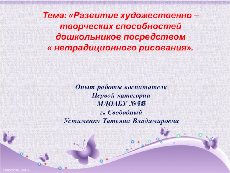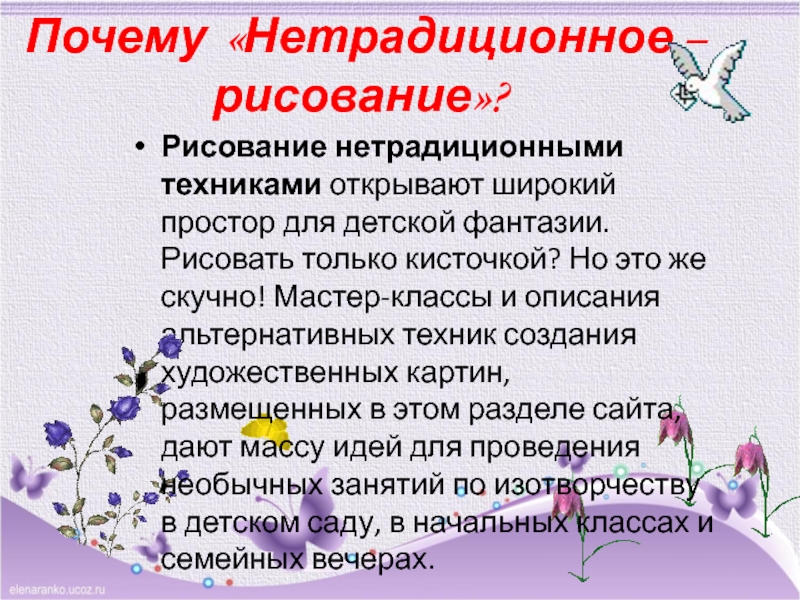 Нестандартные подходы к организации изобразительной деятельности удивляют и восхищают детей, тем самым вызывая стремление заниматься этим интересным делом. Оригинальное рисование без кисточки и карандаша раскрывает креативные возможности ребенка, позволяет почувствовать краски, их характер и настроение.