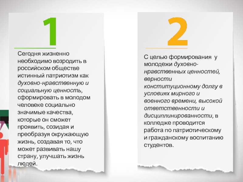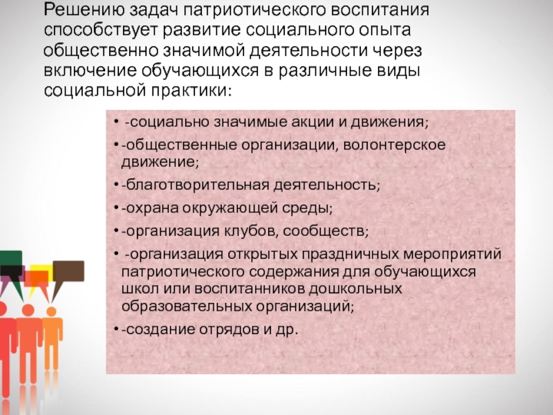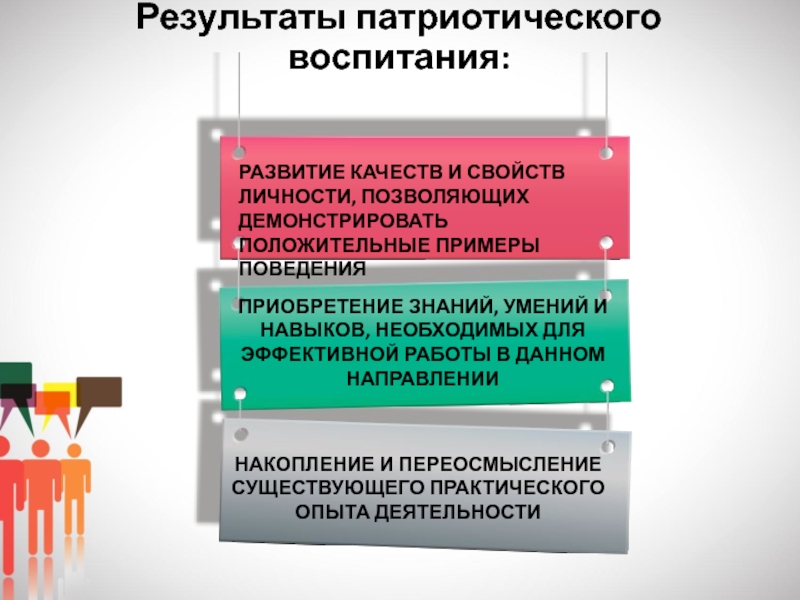 -создание активного общественного мнения в коллективе преподавателей и сотрудников образовательной организации о важности целенаправленной работы по патриотическому воспитанию
