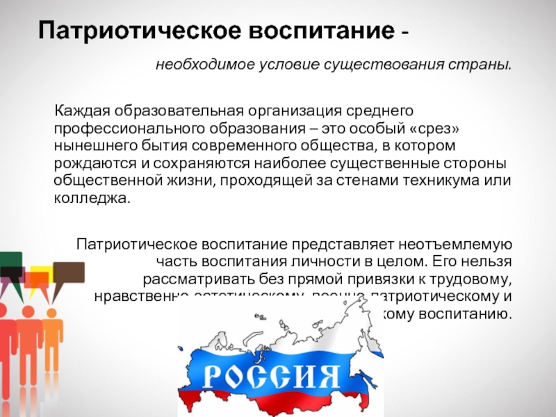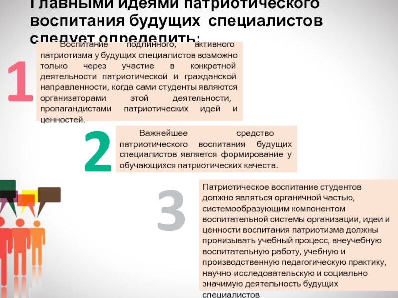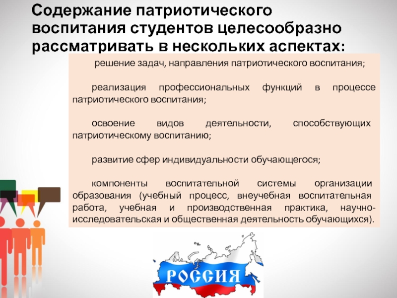 Патриотическое воспитание студентов должно являться органичной частью, системообразующим компонентом воспитательной системы организации, идеи и ценности воспитания патриотизма должны пронизывать учебный процесс, внеучебную воспитательную работу, учебную и производственную педагогическую практику, научно-исследовательскую и социально значимую деятельность будущих специалистов