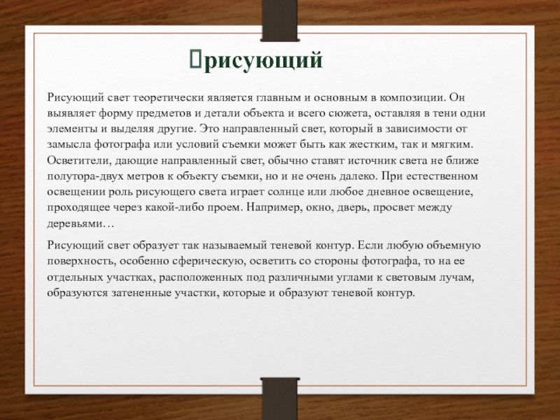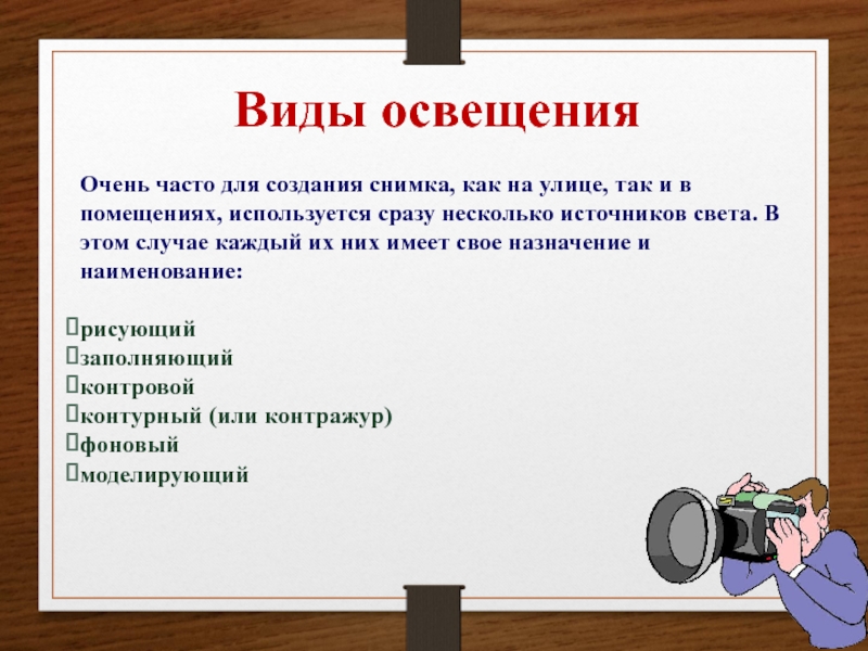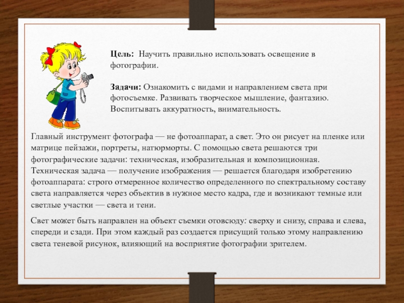 Главный инструмент фотографа — не фотоаппарат, а свет. Это он рисует на пленке или матрице пейзажи, портреты, натюрморты. С помощью света решаются три фотографические задачи: техническая, изобразительная и композиционная. Техническая задача — получение изображения — решается благодаря изобретению фотоаппарата: строго отмеренное количество определенного по спектральному составу света направляется через объектив в нужное место кадра, где и возникают темные или светлые участки — света и тени.