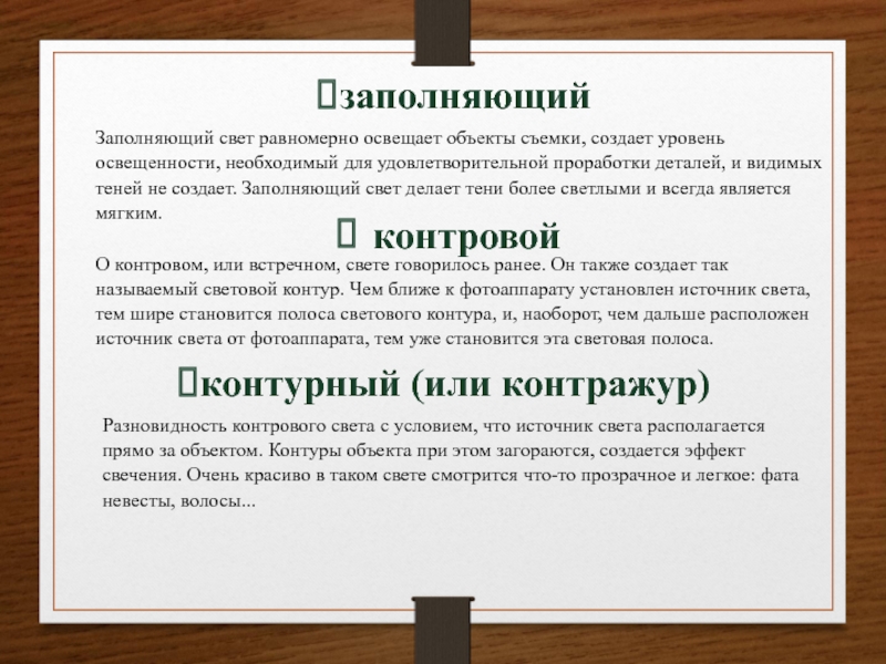 Моделирующий свет несет функции дополнительного заполняющего света и служит для подсветки теней в необходимых местах. Он образуется небольшими источниками мягкого света. Также он применяется для создания местных бликов и рефлексов на различных отражающих деталях объекта съемки. В условиях фотопавильона их форма, цвет и интенсивность могут регулироваться.