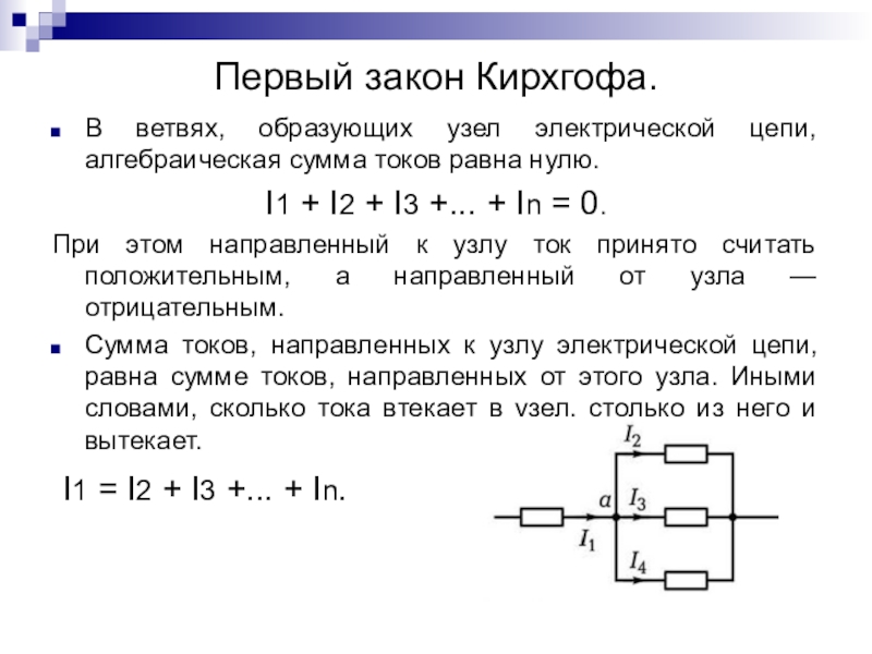 Сумма токов, направленных к узлу электрической цепи, равна сумме токов, направленных от этого узла. Иными словами, сколько тока втекает в узел, столько из него и вытекает.