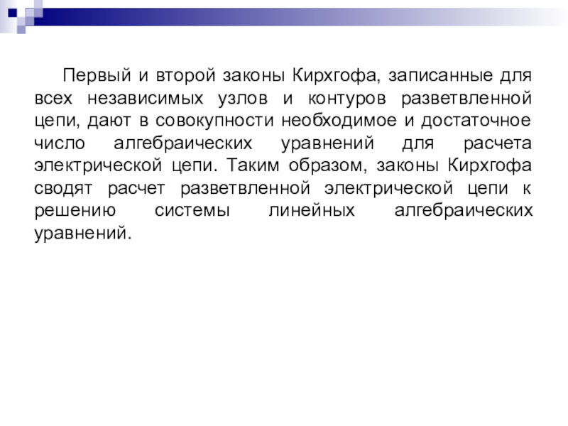 контуров разветвленной цепи, дают в совокупности необходимое и достаточное число алгебраических уравнений для расчета электрической цепи. Таким образом, законы Кирхгофа сводят расчет разветвленной электрической цепи к решению системы линейных алгебраических уравнений.