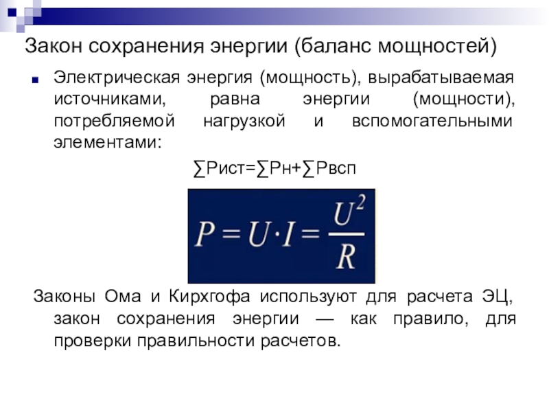 Слайд 11Закон сохранения энергии (баланс мощностей)
