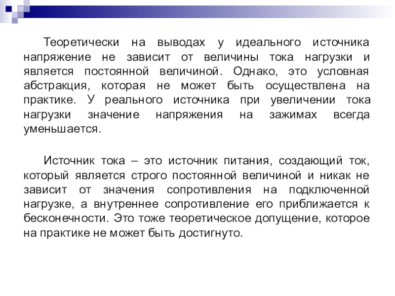 Слайд 4 Теоретически на выводах у идеального источника напряжение не зависит от величины