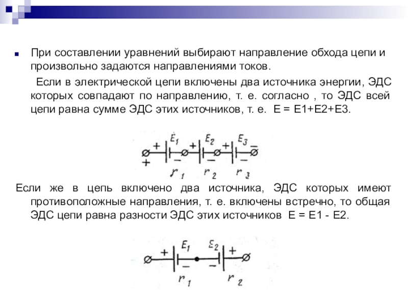 Если в электрической цепи включены два источника энергии, ЭДС которых совпадают по направлению, т. е. согласно , то ЭДС всей цепи равна сумме ЭДС этих источников, т. е. E = E1+E2+Е3.