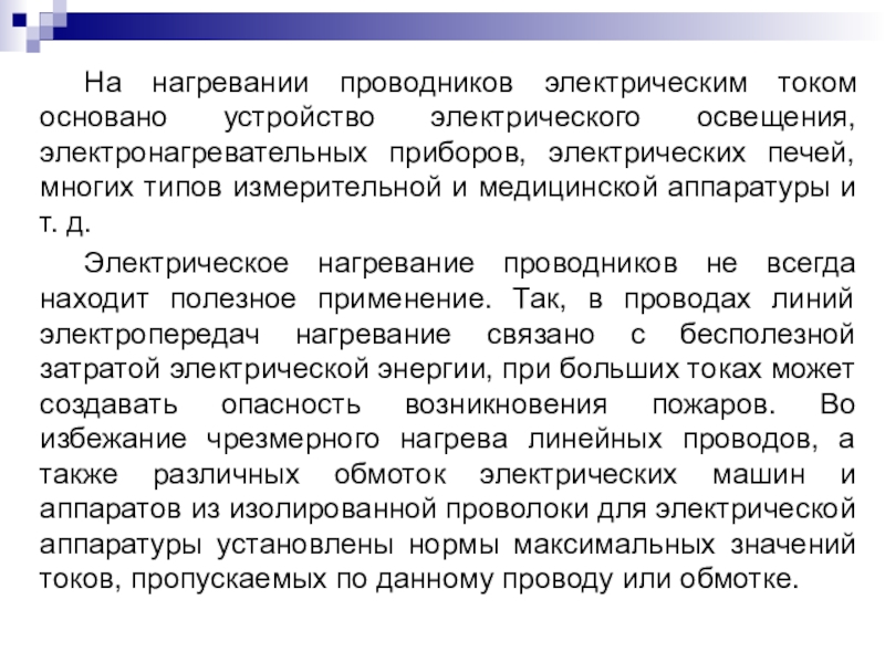 Электрическое нагревание проводников не всегда находит полезное применение. Так, в проводах линий электропередач нагревание связано с бесполезной затратой электрической энергии, при больших токах может создавать опасность возникновения пожаров. Во избежание чрезмерного нагрева линейных проводов, а также различных обмоток электрических машин и аппаратов из изолированной проволоки для электрической аппаратуры установлены нормы максимальных значений токов, пропускаемых по данному проводу или обмотке.