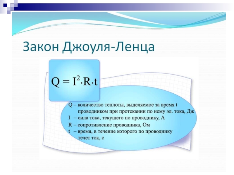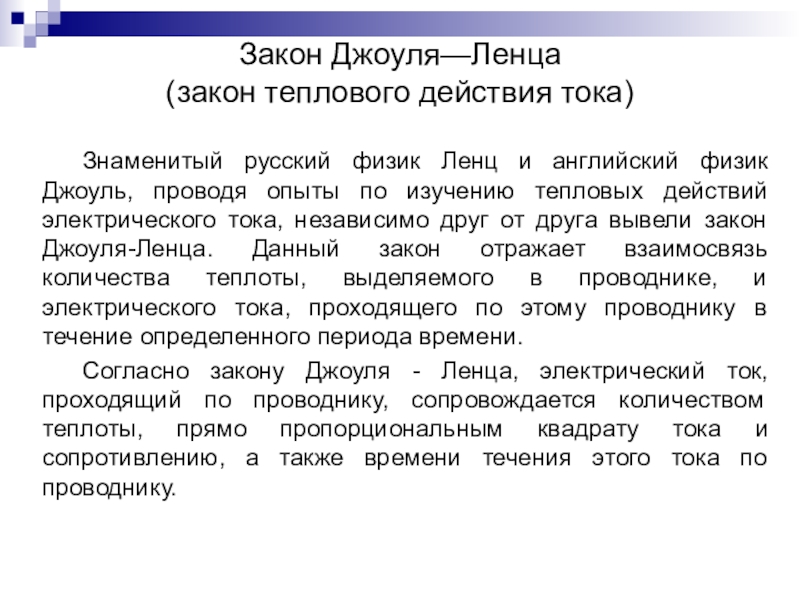 Согласно закону Джоуля - Ленца, электрический ток, проходящий по проводнику, сопровождается количеством теплоты, прямо пропорциональным квадрату тока и сопротивлению, а также времени течения этого тока по проводнику.