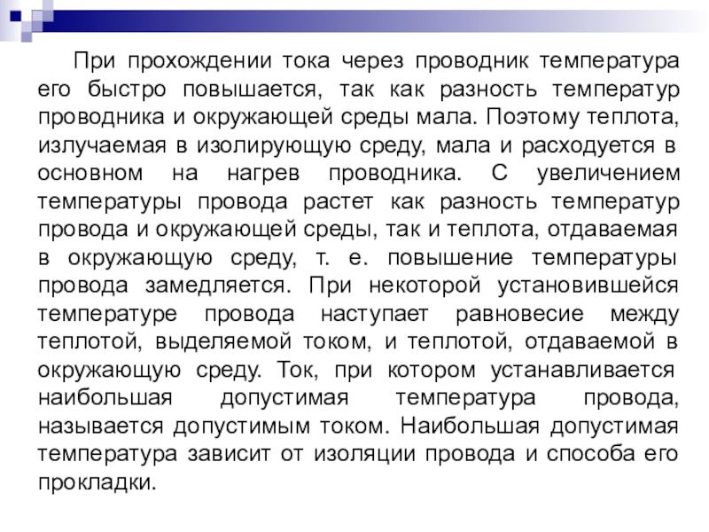 разность температур проводника и окружающей среды мала. Поэтому теплота, излучаемая в изолирующую среду, мала и расходуется в основном на нагрев проводника. С увеличением температуры провода растет как разность температур провода и окружающей среды, так и теплота, отдаваемая в окружающую среду, т. е. повышение температуры провода замедляется. При некоторой установившейся температуре провода наступает равновесие между теплотой, выделяемой током, и теплотой, отдаваемой в окружающую среду. Ток, при котором устанавливается наибольшая допустимая температура провода, называется допустимым током. Наибольшая допустимая температура зависит от изоляции провода и способа его прокладки.