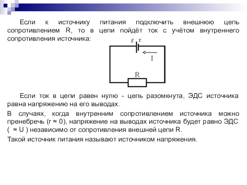 Слайд 3 Если к источнику питания подключить внешнюю цепь сопротивлением R, то в