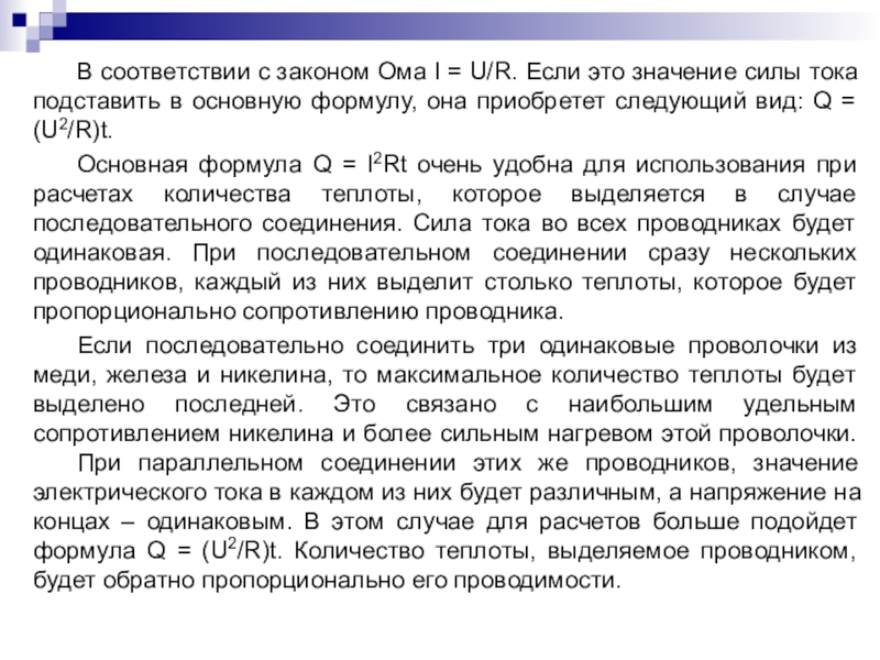 Если последовательно соединить три одинаковые проволочки из меди, железа и никелина, то максимальное количество теплоты будет выделено последней. Это связано с наибольшим удельным сопротивлением никелина и более сильным нагревом этой проволочки. При параллельном соединении этих же проводников, значение электрического тока в каждом из них будет различным, а напряжение на концах – одинаковым. В этом случае для расчетов больше подойдет формула Q = (U2/R)t. Количество теплоты, выделяемое проводником, будет обратно пропорционально его проводимости.