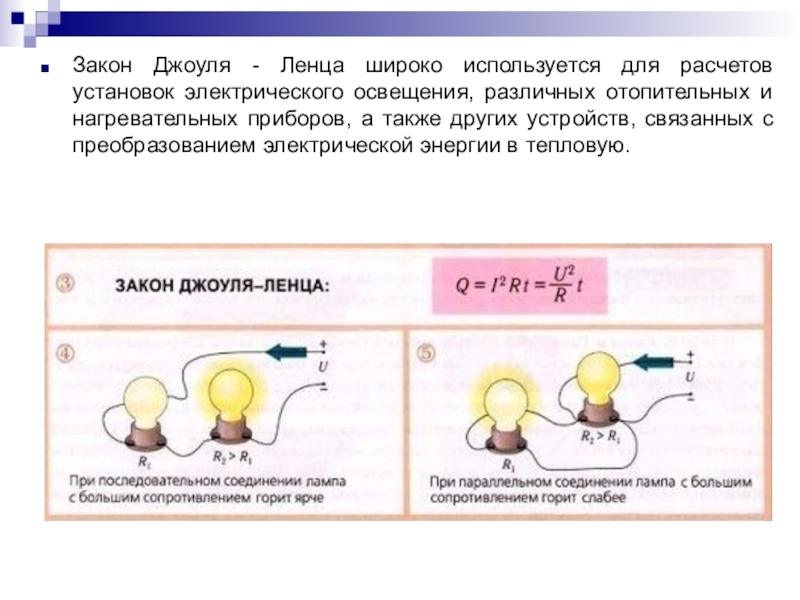 Слайд 16Закон Джоуля - Ленца широко используется для расчетов установок электрического освещения,