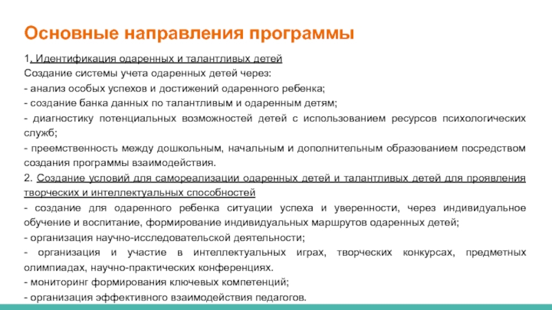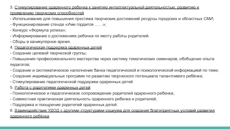 - Создание индивидуальных программ по развитию творческого потенциала талантливого ребёнка;