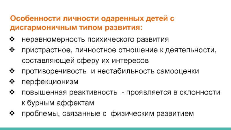 Слайд 11Особенности личности одаренных детей с дисгармоничным типом развития: