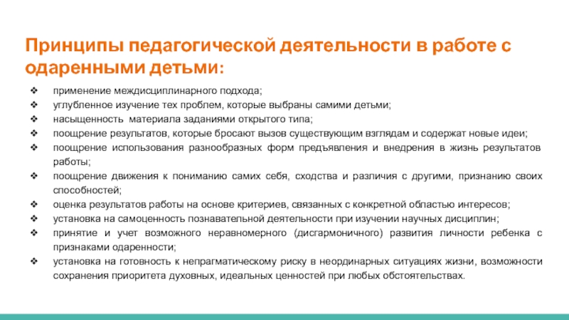 Слайд 17Принципы педагогической деятельности в работе с одаренными детьми: