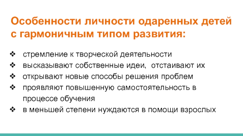 Слайд 10Особенности личности одаренных детей с гармоничным типом развития: