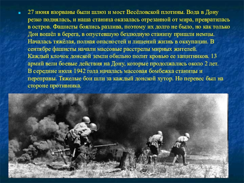 Дону резко поднялась, и наша станица оказалась отрезанной от мира, превратилась в остров. Фашисты боялись разлива, поэтому их долго не было, но как только Дон вошёл в берега, в опустевшую безлюдную станицу пришли немцы. Началась тяжёлая, полная опасностей и лишений жизнь в оккупации. В сентябре фашисты начали массовые расстрелы мирных жителей.