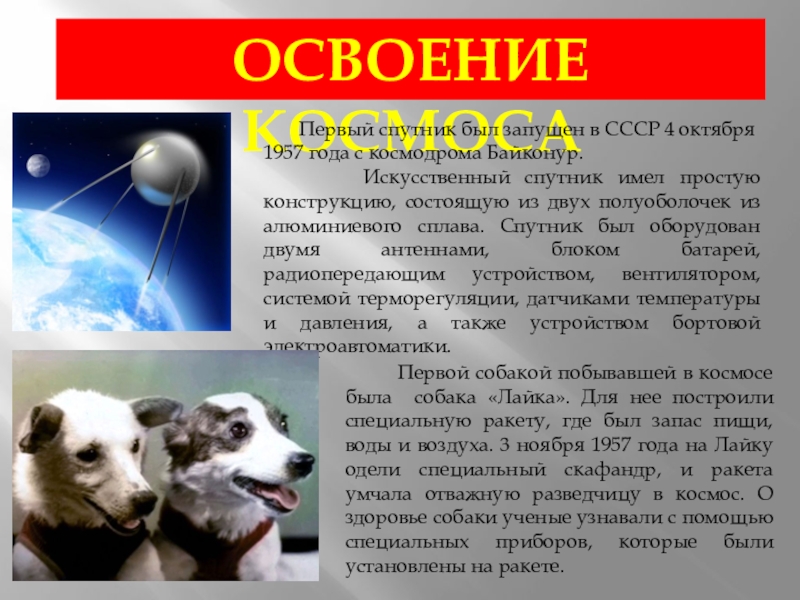 Первой собакой побывавшей в космосе была собака «Лайка». Для нее построили специальную ракету, где был запас пищи, воды и воздуха. 3 ноября 1957 года на Лайку одели специальный скафандр, и ракета умчала отважную разведчицу в космос. О здоровье собаки ученые узнавали с помощью специальных приборов, которые были установлены на ракете.