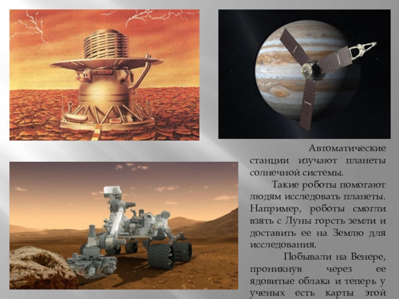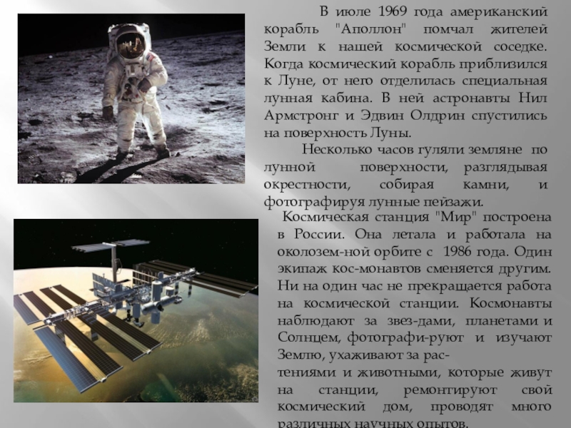 Космическая станция "Мир" построена в России. Она летала и работала на околозем-ной орбите с 1986 года. Один экипаж кос-монавтов сменяется другим. Ни на один час не прекращается работа на космической станции. Космонавты наблюдают за звез-дами, планетами и Солнцем, фотографи-руют и изучают Землю, ухаживают за рас-