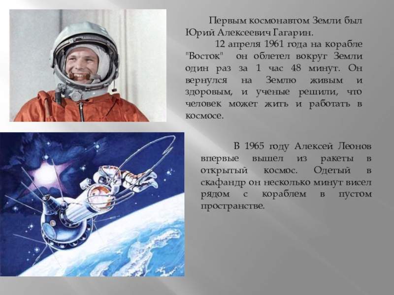 В 1965 году Алексей Леонов впервые вышел из ракеты в открытый космос. Одетый в скафандр он несколько минут висел рядом с кораблем в пустом пространстве.
