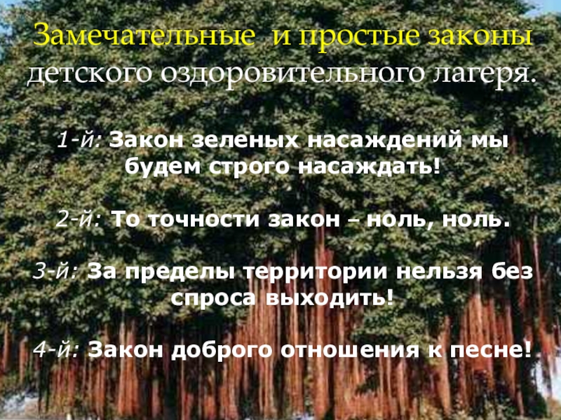 Замечательные и простые законыдетского оздоровительного лагеря.1-й: Закон зеленых насаждений мы будем строго насаждать!2-й: То точности закон – ноль, ноль.3-й: За пределы территории нельзя без спроса выходить!4-й: Закон доброго отношения к песне!
