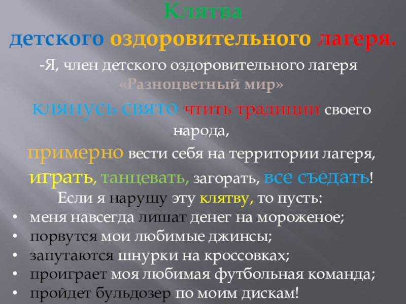 Клятва  детского оздоровительного лагеря. Я, член детского оздоровительного лагеря «Разноцветный мир»клянусь свято чтить традиции своего народа,