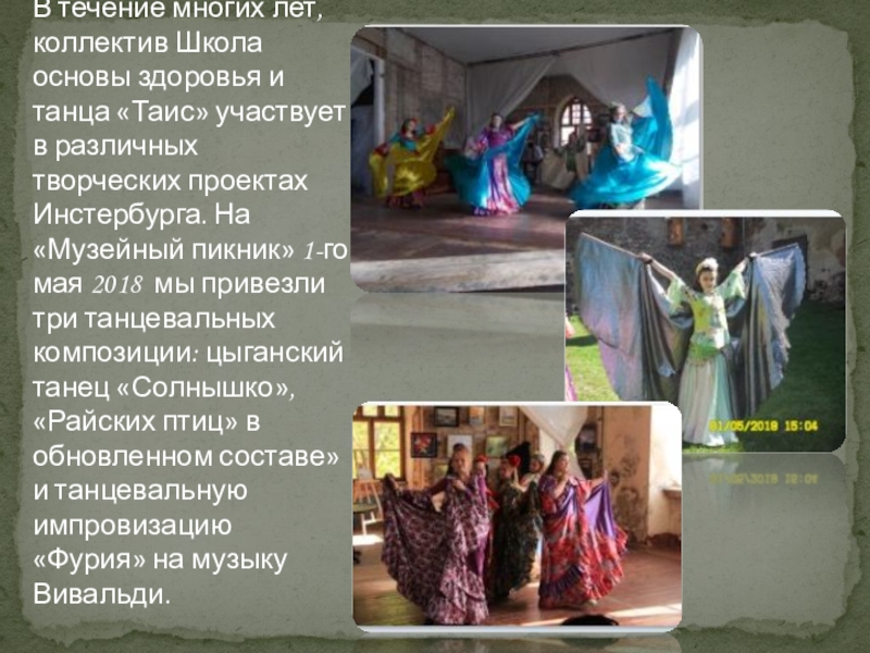 В течение многих лет, коллектив Школа основы здоровья и танца «Таис» участвует в различных творческих проектах Инстербурга.