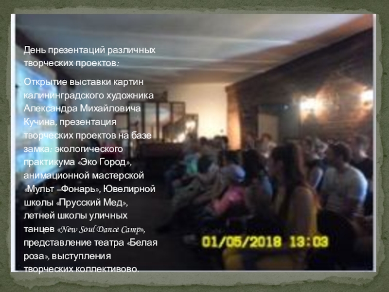 Михайловича Кучина, презентация творческих проектов на базе замка: экологического практикума «Эко Город», анимационной мастерской «Мульт –Фонарь», Ювелирной школы «Прусский Мед», летней школы уличных танцев «New Soul Dance Camp», представление театра «Белая роза», выступления творческих коллективово.