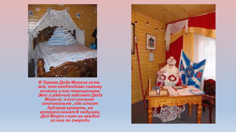 самому хозяину и его помощникам. Это и рабочий кабинет Деда Мороза, и его спальня- опочивальня , где стоит дубовая кровать, на которой лежат 8 подушек, Дед Мороз спит на каждой из них по очереди