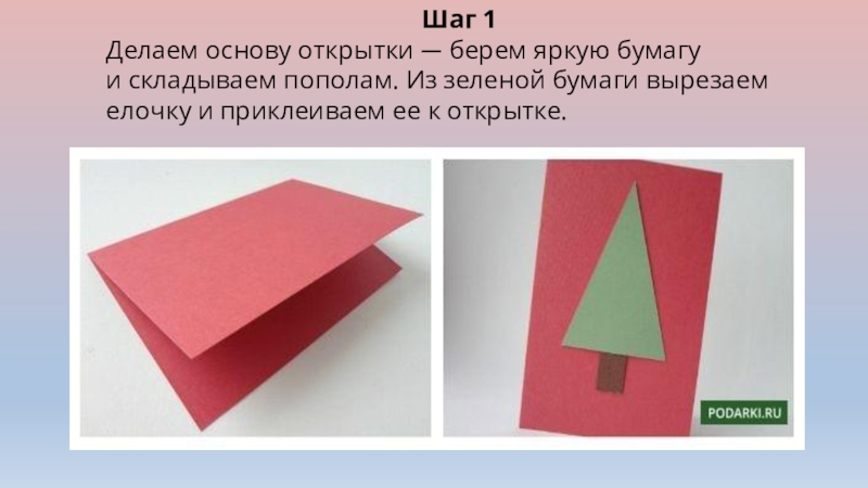 Делаем основу открытки — берем яркую бумагу и складываем пополам. Из зеленой бумаги