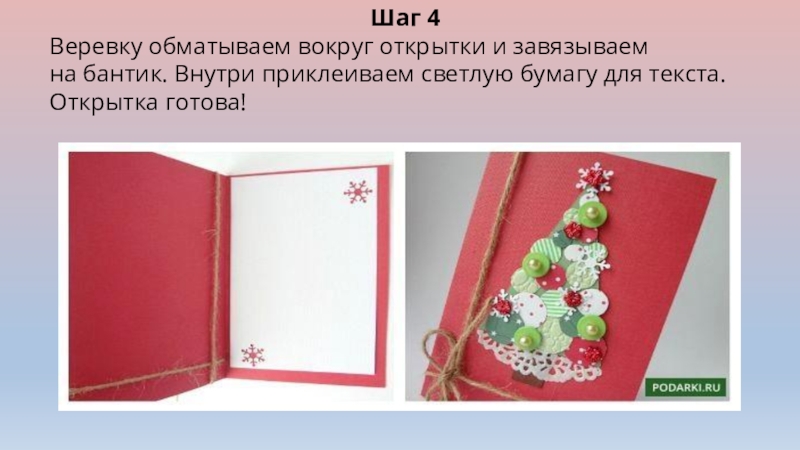 Веревку обматываем вокруг открытки и завязываем на бантик. Внутри приклеиваем светлую бумагу