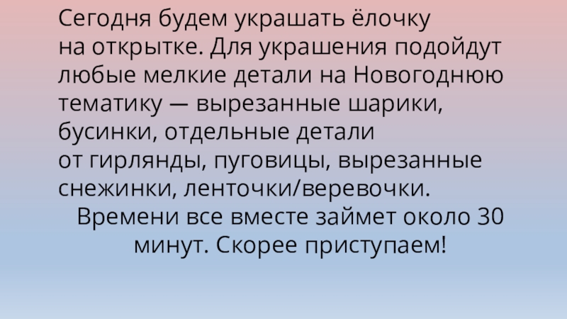 Слайд 20Сегодня будем украшать ёлочку на открытке. Для украшения подойдут любые мелкие детали на Новогоднюю