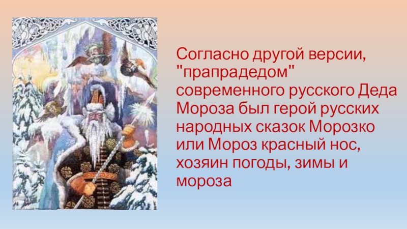 Слайд 6Согласно другой версии, "прапрадедом" современного русского Деда Мороза был герой русских