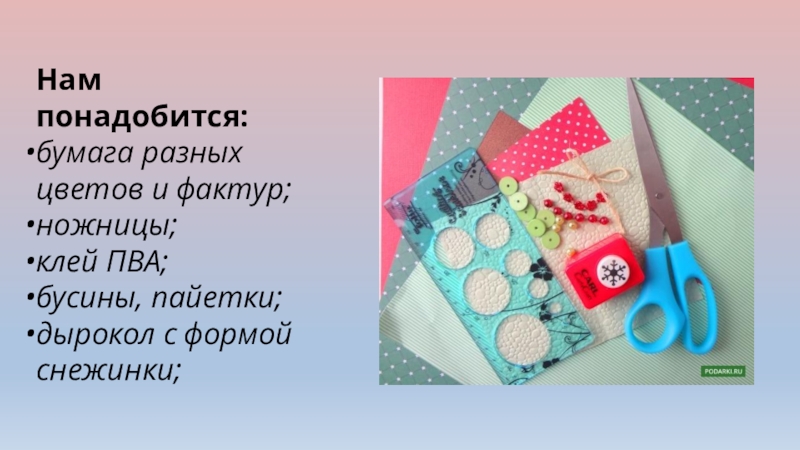 тематику — вырезанные шарики, бусинки, отдельные детали от гирлянды, пуговицы, вырезанные снежинки, ленточки/веревочки.