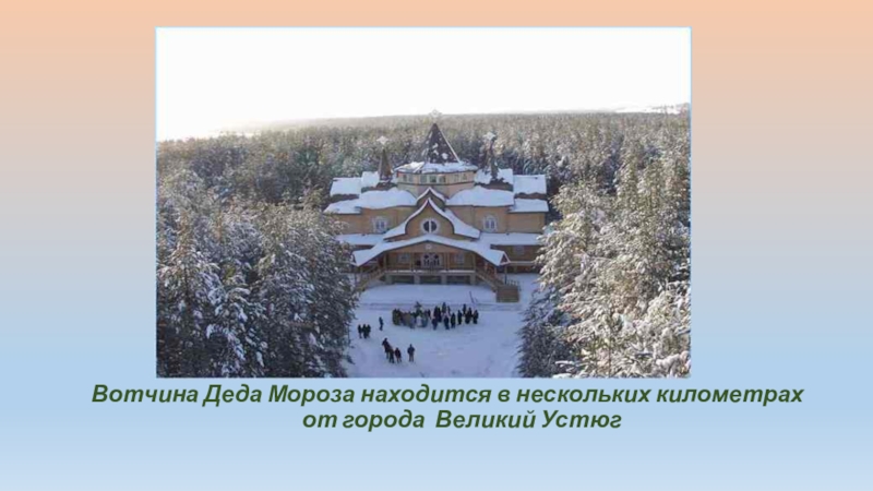 Слайд 13Вотчина Деда Мороза находится в нескольких километрах от города Великий Устюг