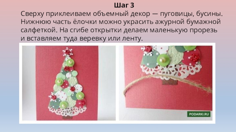 украсить ажурной бумажной салфеткой. На сгибе открытки делаем маленькую прорезь и вставляем туда веревку или ленту.