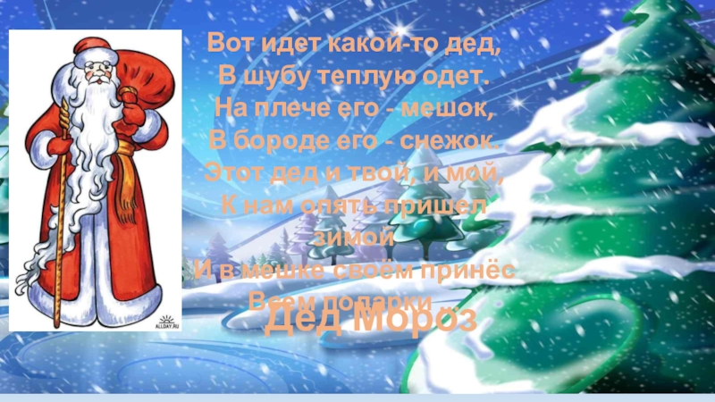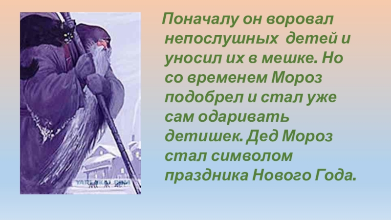 мешке. Но со временем Мороз подобрел и стал уже сам одаривать детишек. Дед Мороз стал символом праздника Нового Года.