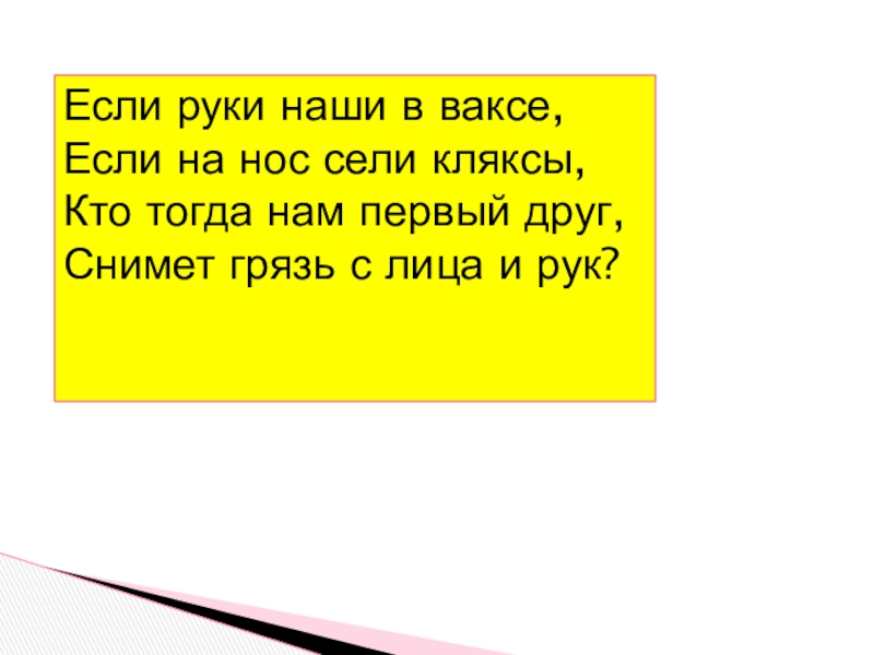 Слайд 8Если руки наши в ваксе, Если на нос сели кляксы, Кто тогда нам