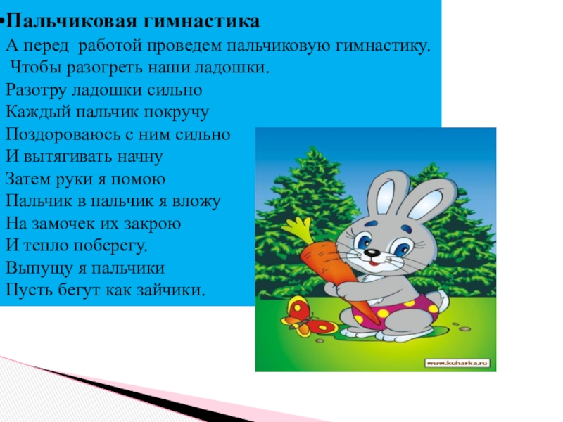 Пальчиковая гимнастикаА перед  работой проведем пальчиковую гимнастику. Чтобы разогреть наши ладошки.Разотру ладошки сильноКаждый пальчик покручуПоздороваюсь с ним