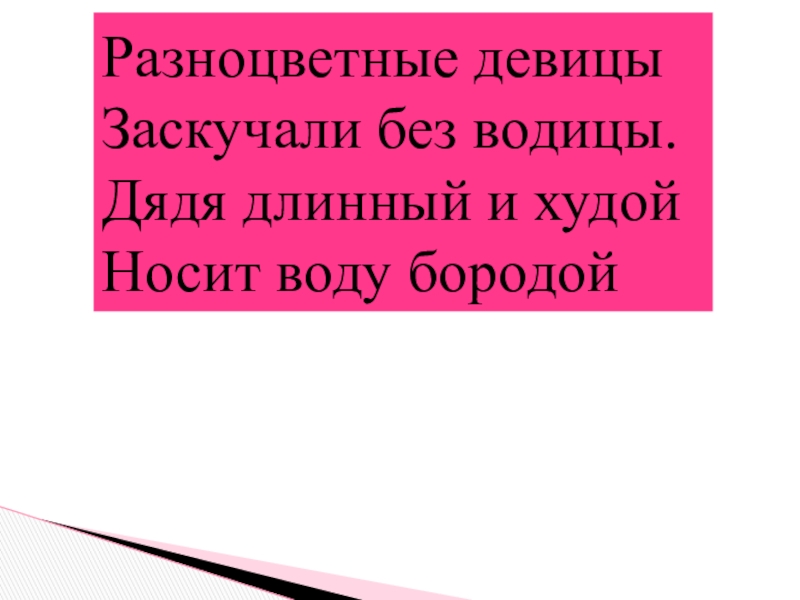 Разноцветные девицыЗаскучали без водицы.Дядя длинный и худойНосит воду бородой