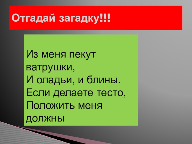 Отгадай загадку!!!Из меня пекут ватрушки, И оладьи, и блины. Если делаете тесто, Положить меня должны