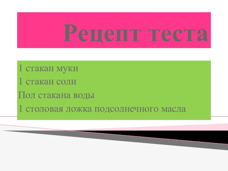 Рецепт теста1 стакан муки1 стакан солиПол стакана воды1 столовая ложка подсолнечного масла