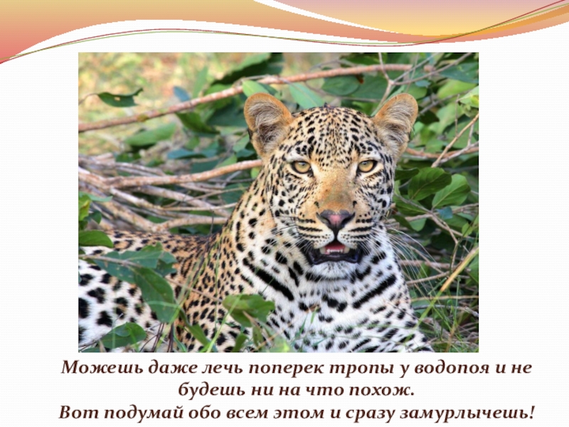 Слайд 27Можешь даже лечь поперек тропы у водопоя и не будешь ни