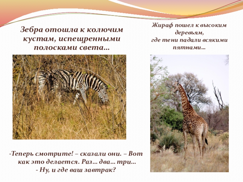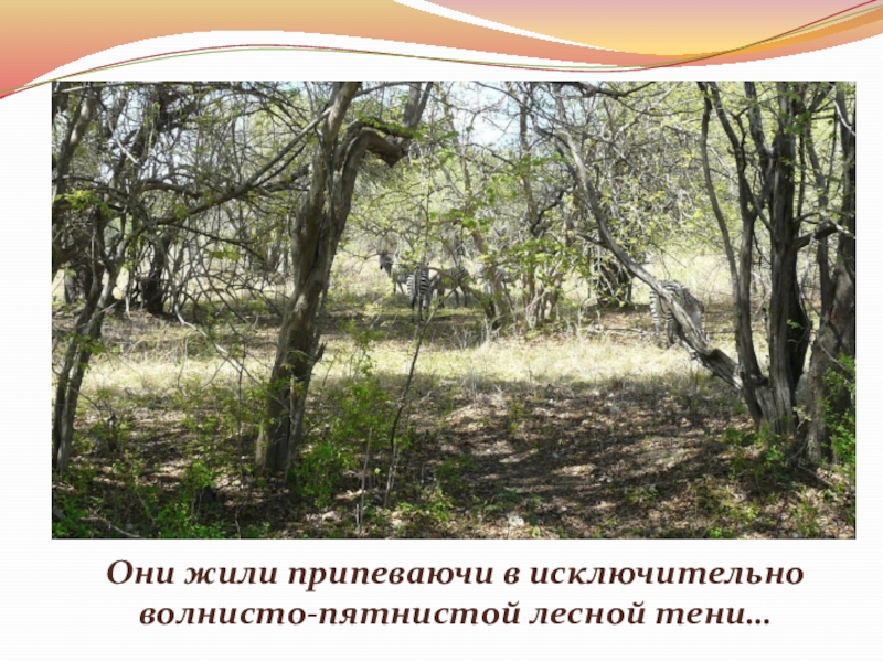 Слайд 21Зебра отошла к колючим кустам, испещренными полосками света…