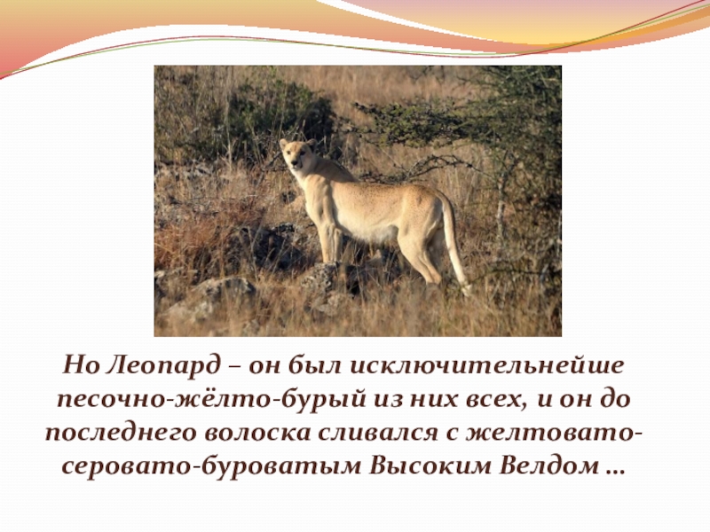 Слайд 5Но Леопард – он был исключительнейше песочно-жёлто-бурый из них всех, и