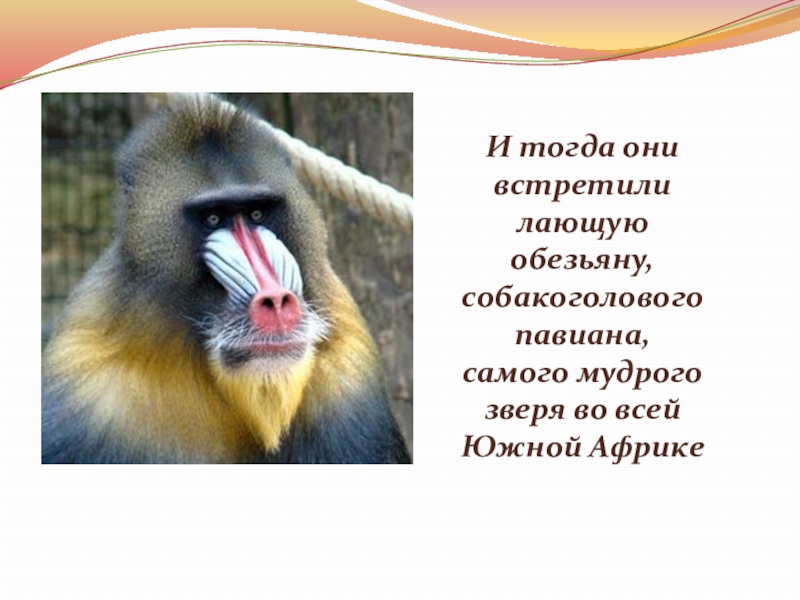 Слайд 16И тогда они встретили лающую обезьяну, собакоголового павиана, самого мудрого зверя