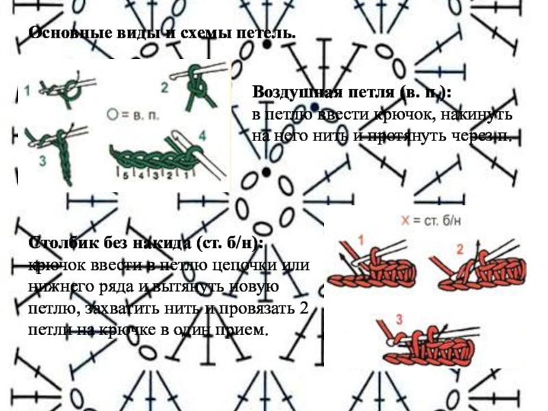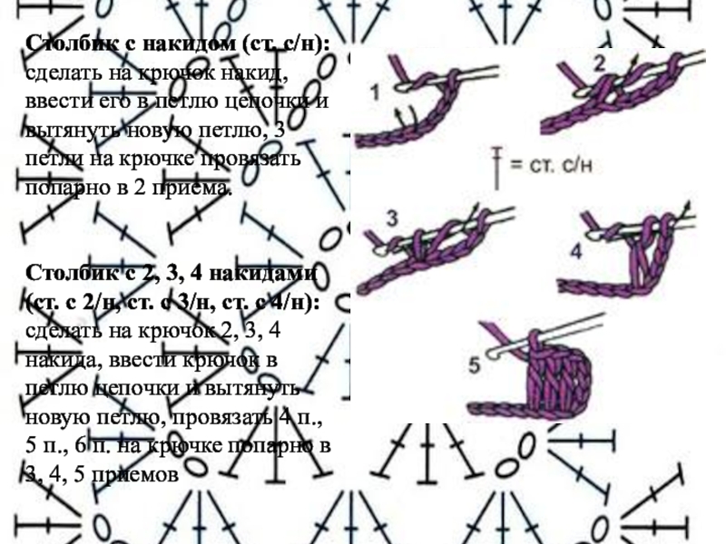 Столбик с 2, 3, 4 накидами (ст. с 2/н, ст. с 3/н, ст. с 4/н):
