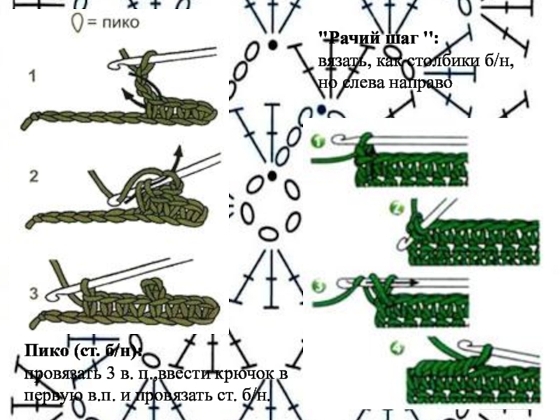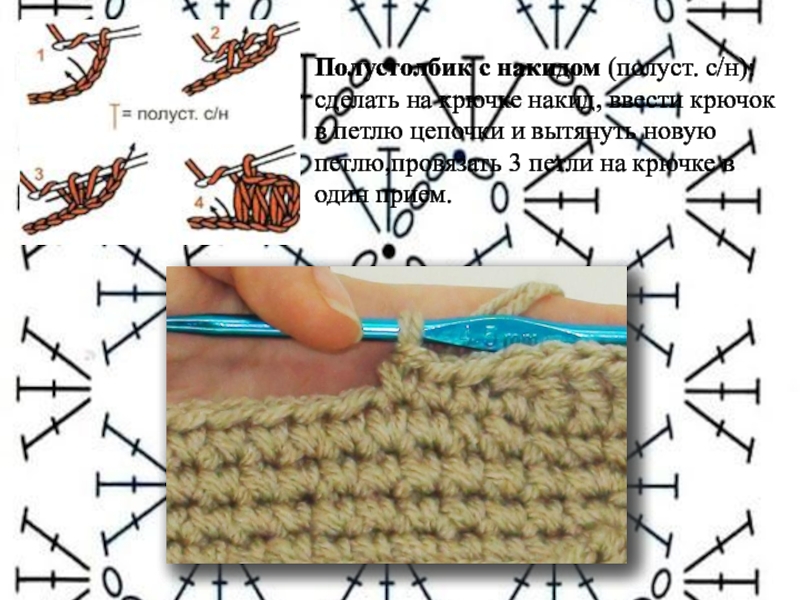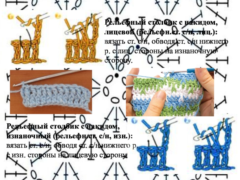 вязать ст. с/н, обводя ст. с/н нижнего р. с изн. стороны на лицевую сторону.