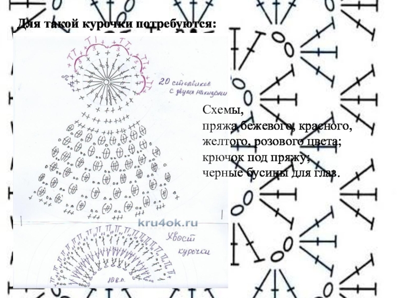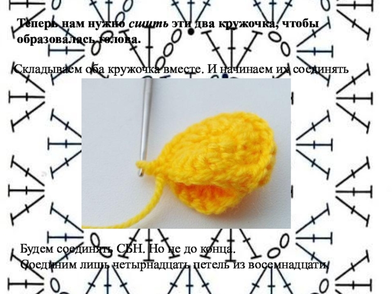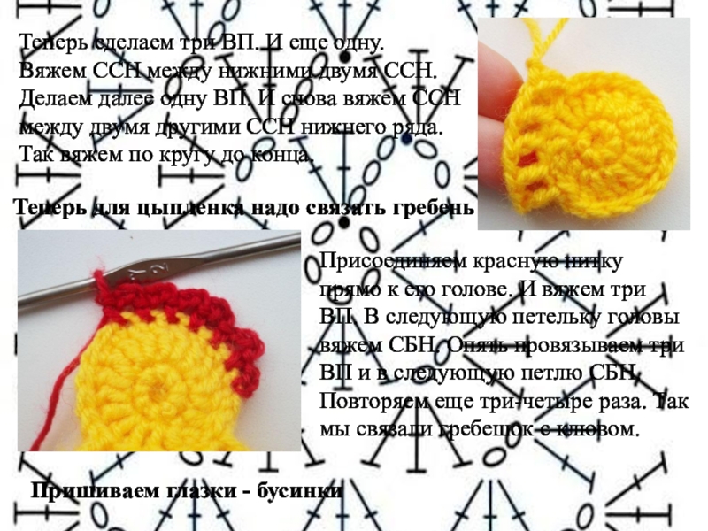 Присоединяем красную нитку прямо к его голове. И вяжем три ВП. В следующую петельку головы вяжем СБН. Опять провязываем три ВП и в следующую петлю СБН. Повторяем еще три-четыре раза. Так мы связали гребешок с клювом.