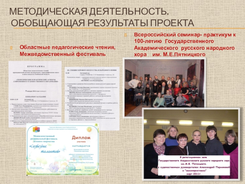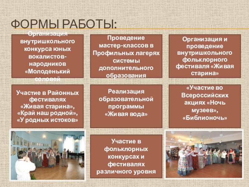 «Народный хор», «Народная художественная культура», в ходе интегрированных уроков, а также во внеурочной деятельности.